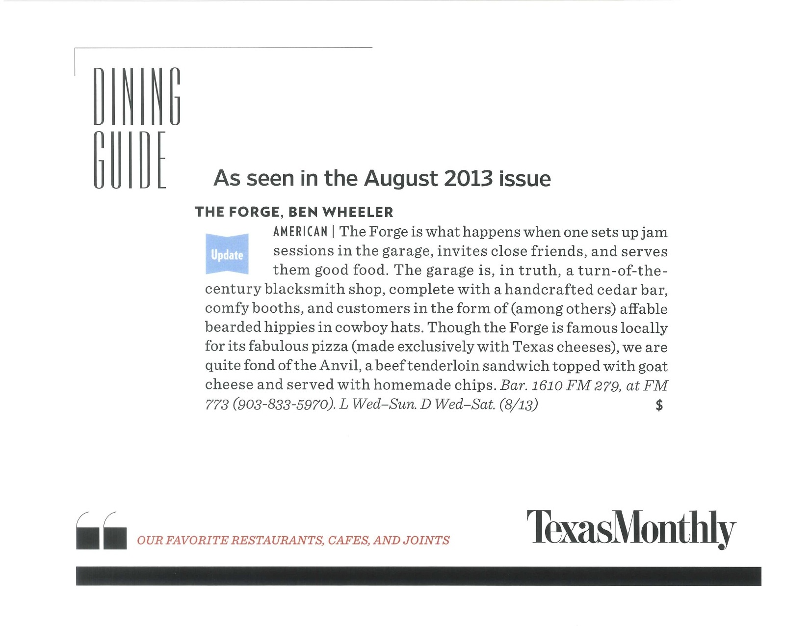 That’s right, The Forge Bar and Grill was written up as one of Texas Monthly’s “Favorite Restaurants, Cafe’s and Joints.” Sufficed to say, we were thrilled! Kudos to our staff and the great patrons that make this all possible! Thanks Texas Monthly!